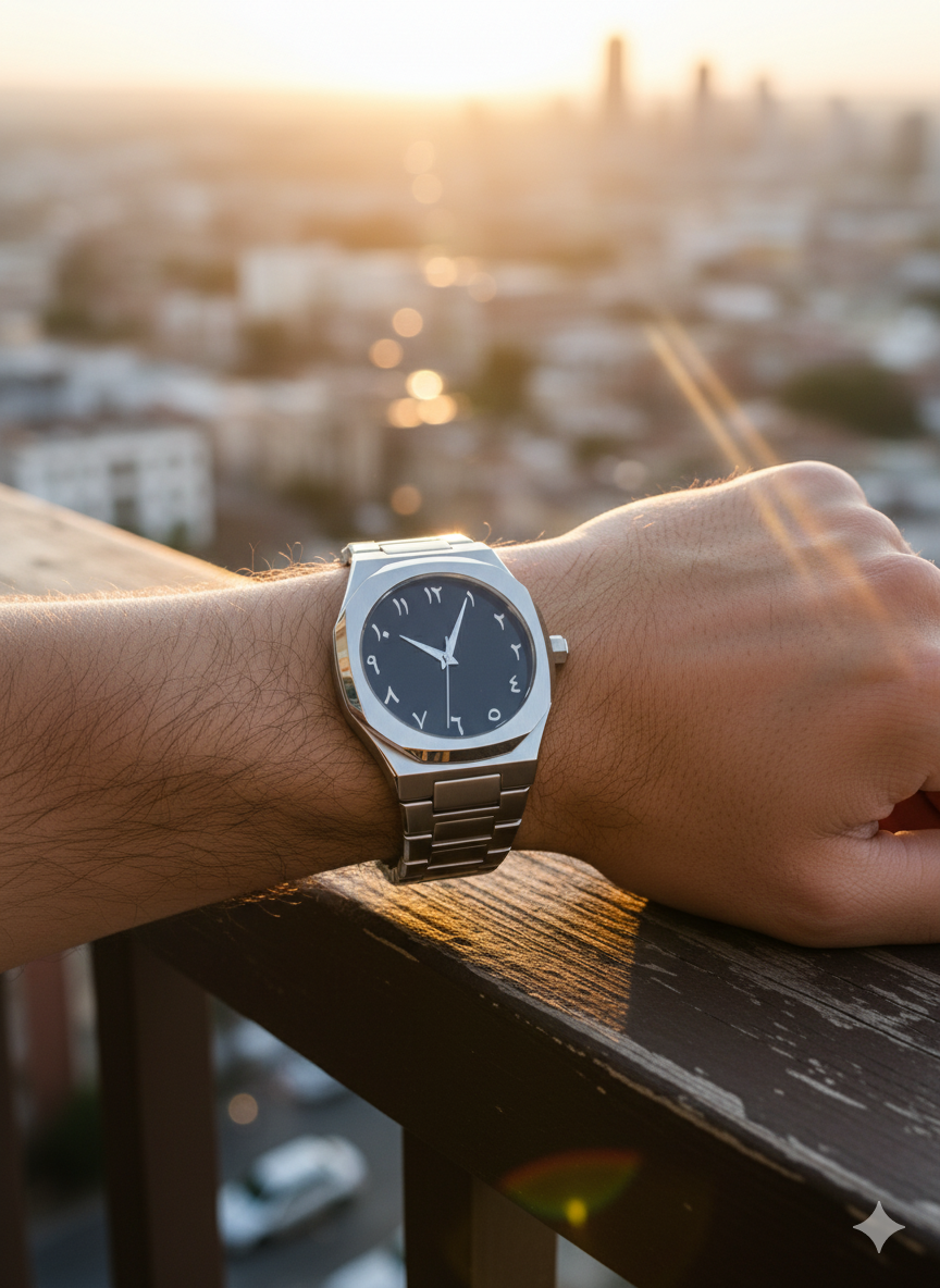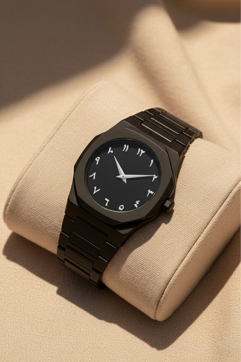 Each piece is built with premium materials and a meticulous finish, designed to age beautifully. Subtle Arabic influences live in our forms, textures, and typography—never loud, always intentional. This is time, elevated.