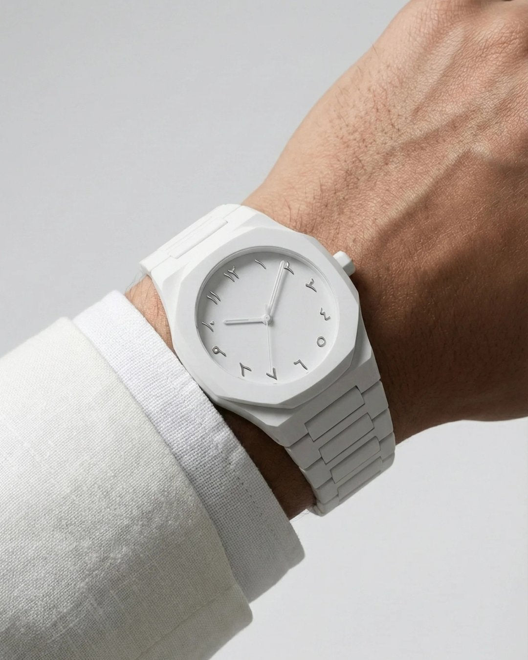The Qamari Abyad embodies refined minimalism with a sense of calm sophistication. Featuring a crisp white matte dial and silver Arabic numerals, this watch reflects balance, purity, and timeless design.