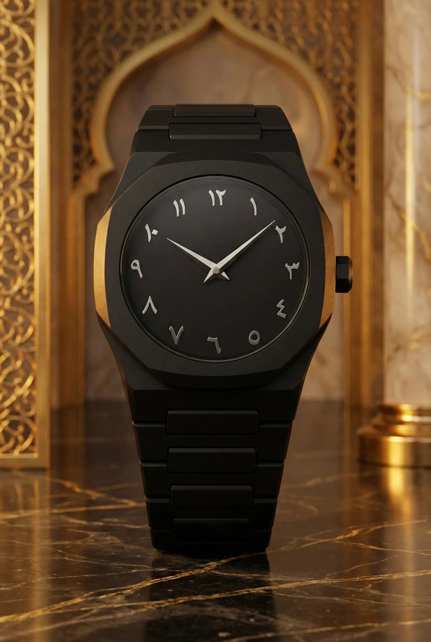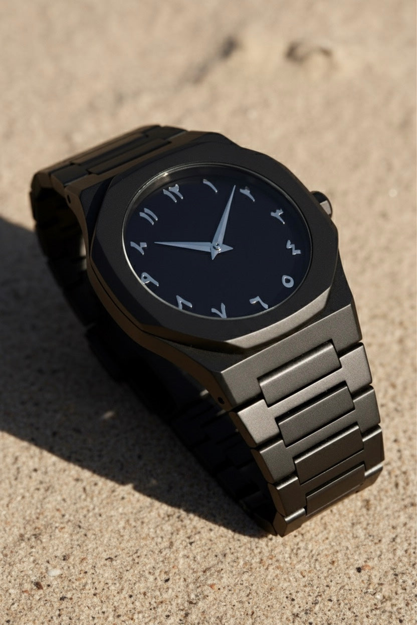 The Qamari Layl is designed for those who appreciate clean design and timeless style. With its matte black finish and Arabic numeral dial, this watch gives a calm and confident look that fits perfectly with any outfit.